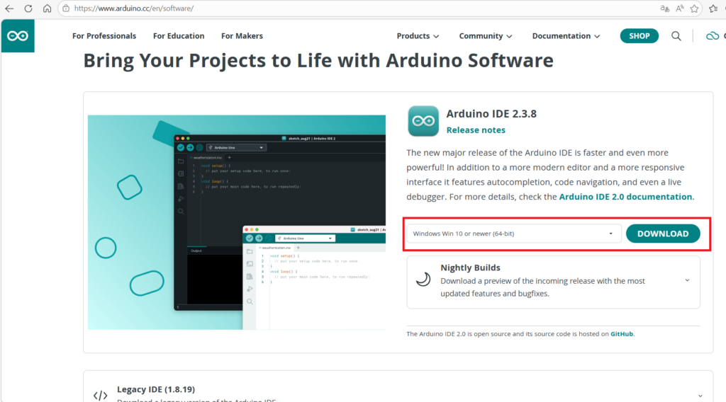 下記のArduino更新サイトより、使用するPCに対応するインストーラーをダウンロードしてください。