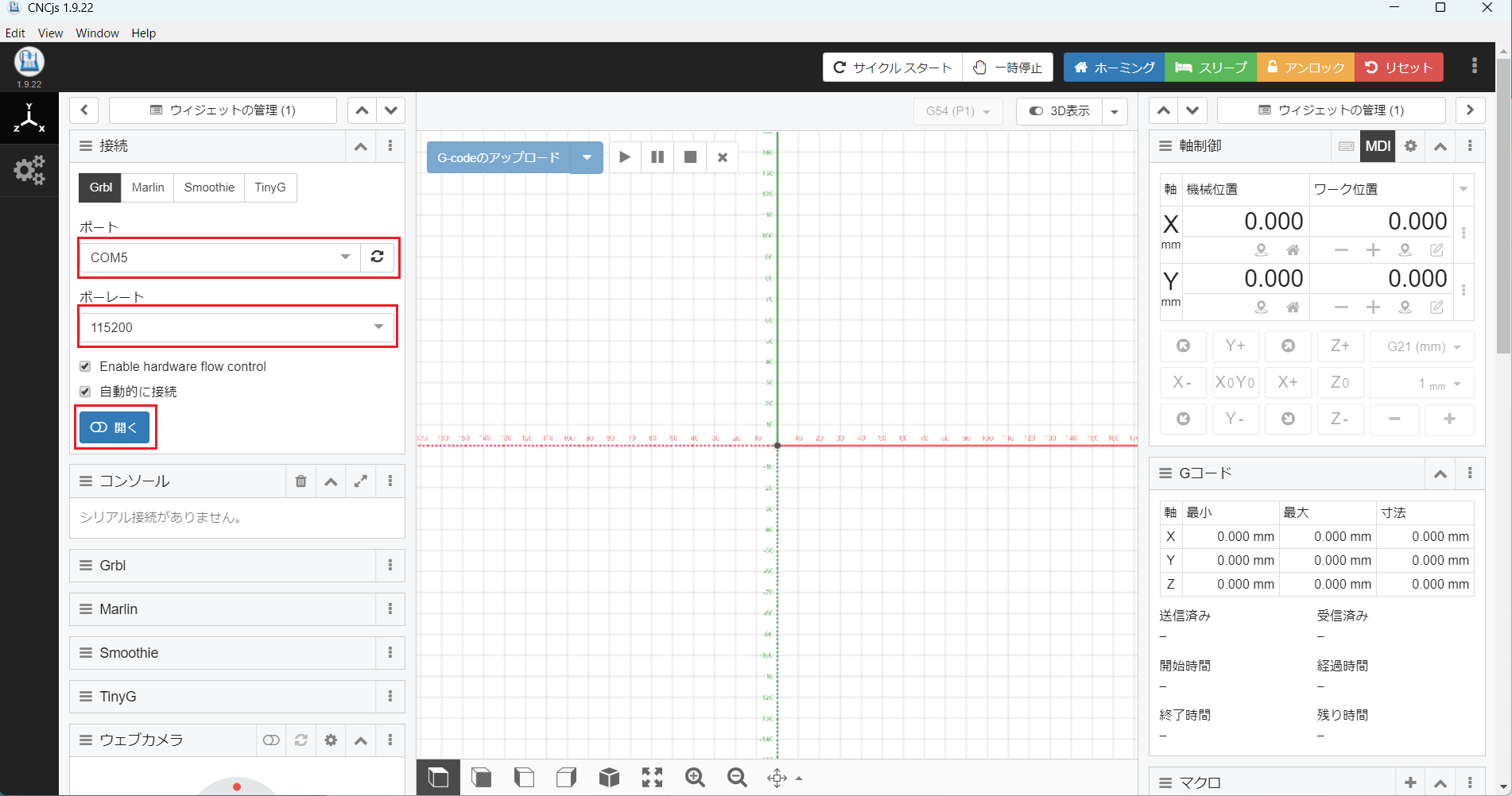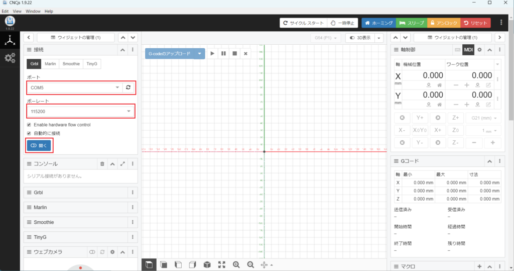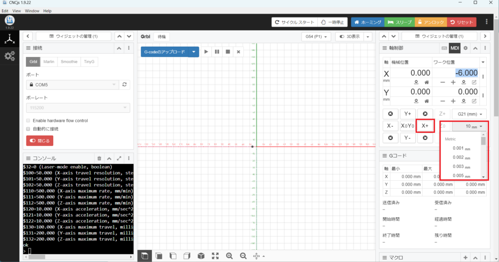 いわば、CNCマシンの「コックピット」のような存在ですね。ポート番号を選び、ボーレートを「115200」に設定して接続すれば、ついにPCの画面からXYテーブルをミリ単位で操れるようになります。