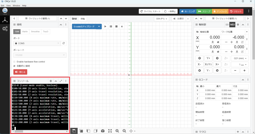 • コンソールに初期設定一覧が表示されればCNCjsとAruduino 間の接続完了です。
