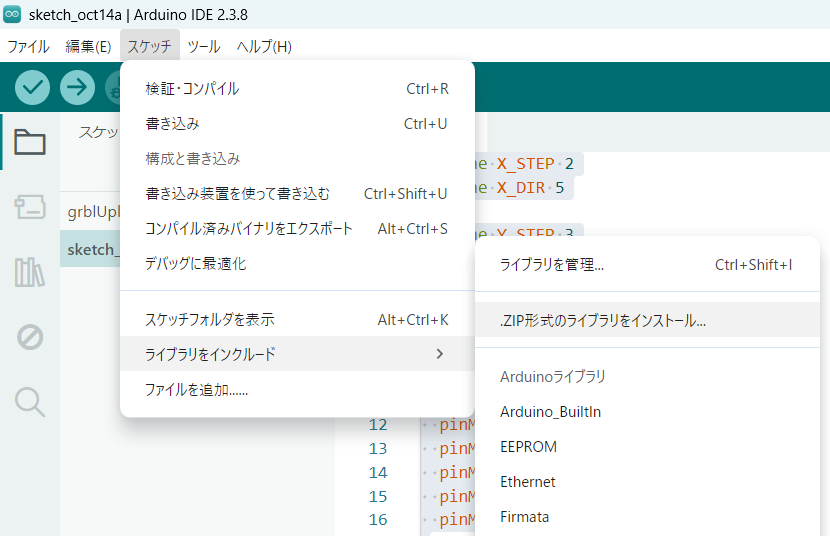 • 「スケッチ」-「ライブラリをインクルード」-「ZIP形式ライブラリをインストール」をクリック