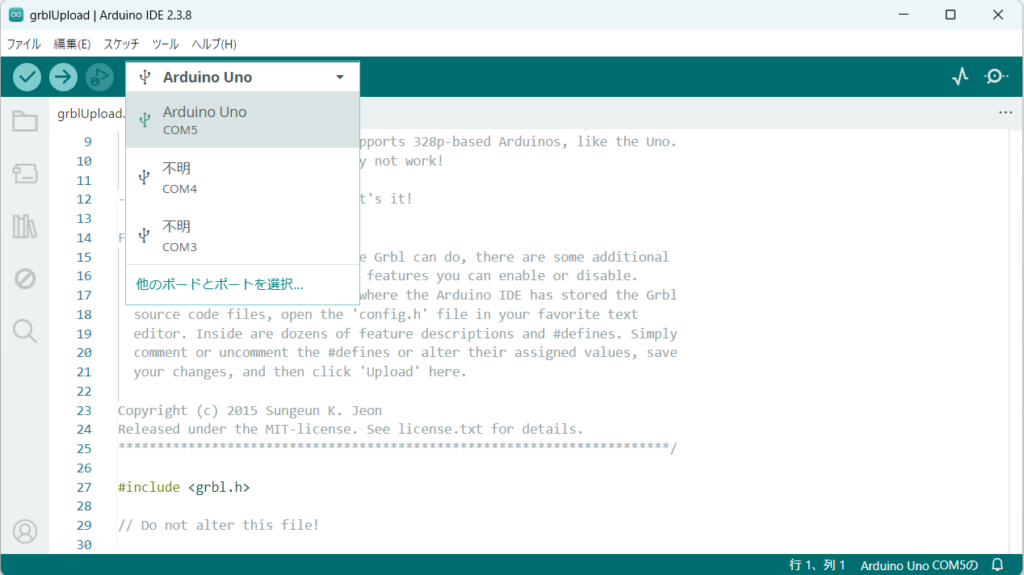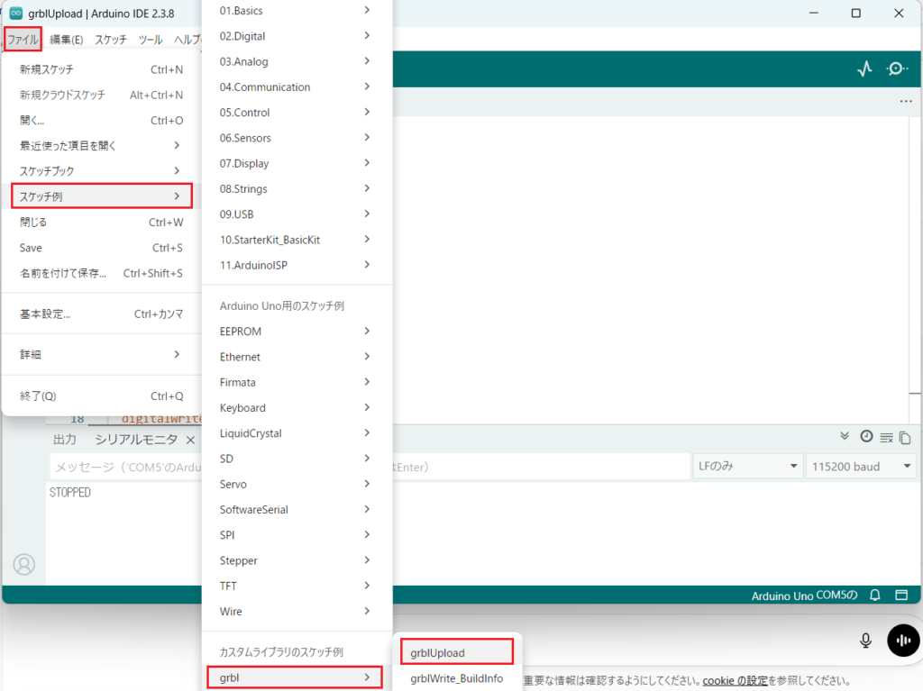 • Arduino IDEにて「ファイル」-「スケッチ例」-「grbl」-「grblUpload」をクリック