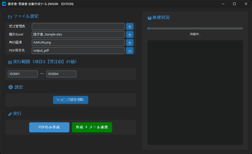 # 受注管理表のExcelファイルからデータを読み込み、請求書の雛形となるExcelファイルに書き込んでPDF化するサンプルコード
