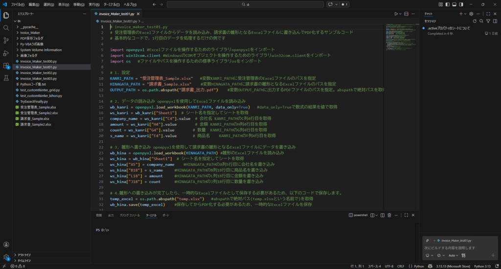 いかがだったでしょうか? たった数十行のコードを実行するだけで、指定したフォルダに見事なPDFの請求書が出現したはずです。手作業によるコピペの呪縛から解放された瞬間です。