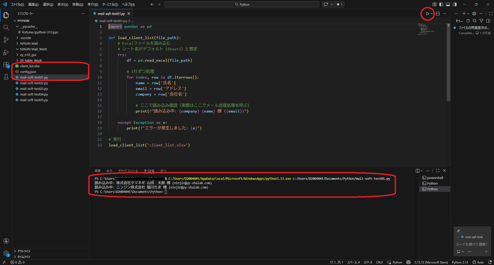 • client_list.xlsxはPythonコード(mail-soft-test01.py)と同じフォルダ内に設置して下さい。
