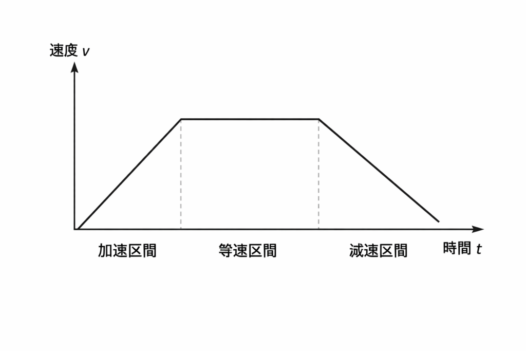 停止しているモーターをいきなり高速で回そうとすると、負荷に耐えきれず「脱調(空回り)」して止まってしまいます。これを防ぐために、以下の3つのフェーズに分けて速度を制御します。これを**「台形駆動(速度プロファイル)」**と呼びます。