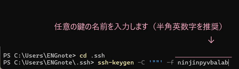以下のコマンドを実行します。-f の後は好きな鍵名でOKです。