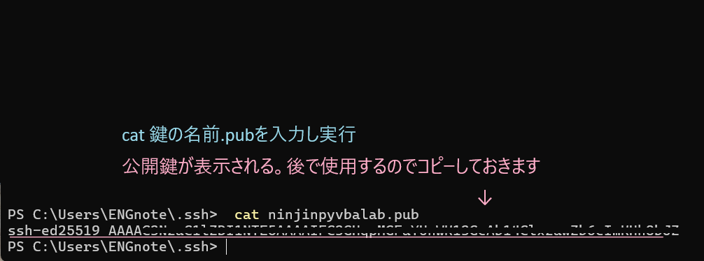 以下のコマンドを実行して公開鍵を確認し、メモ帳などにコピーしておきます