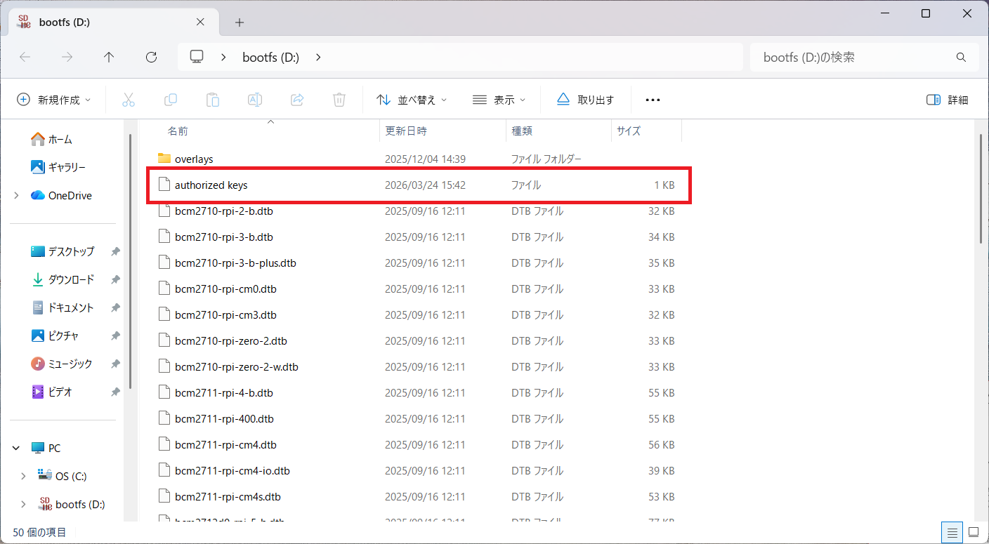 Raspberry PiのOSを書き込んだMicroSDカードをPCに差し、ルートディレクトリ(bootパーティション)に authorized_keys という名前のファイルを作成。※拡張子をつけない