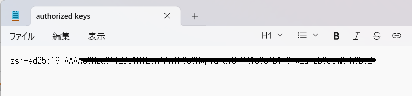 - 先ほどコピーした公開鍵(ssh-ed25519 …)を貼り付けます。