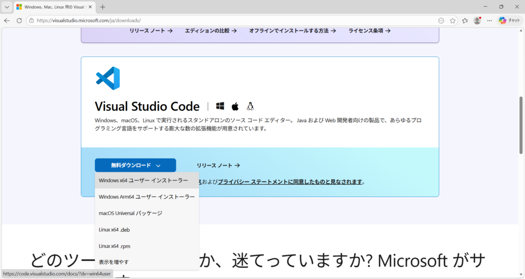 VS Code公式サイトよりソフトをインストール