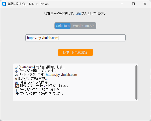 ターゲットがWordPressサイトなら迷わずこれ。HTMLの解析が不要なため、爆速かつ100%正確にデータを抽出できます。 - Seleniumモード: